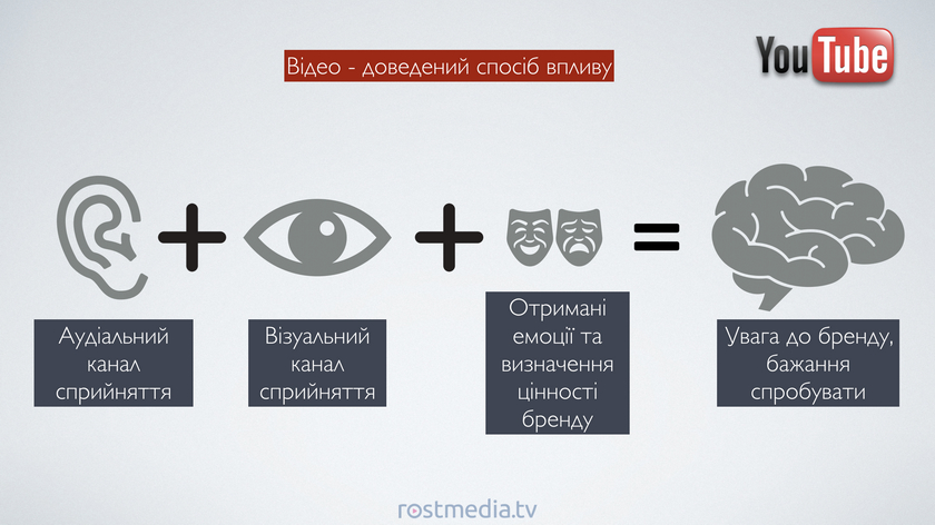 Ефективність відео пояснюється психологією: одночасний вплив на аудіальний канал (звук) та візуальний канал (відео) сприйняття допомагає людині найкраще запам’ятати отриману інформацію (вашу назву та переваги продукту). Якщо сюжет відеоролику викликає емоції – тоді вже створюється більш стійкий зв’язок у пам’яті про вас та в рази збільшується бажання спробувати ваш продукт.