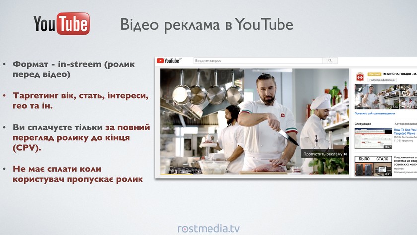 3.Стратегія розміщення. YouTube на сьогодні є медійною платформою №1 в Україні та охоплює більше 70% користувачів інтернет. YouTube пропонує багато можливостей для рекламодавців і має найдоступнішу вартість контакту для відеореклами в діджитал-просторі країни. Показ налаштовується виключно на обраний регіон та ретельно підібрану цільову аудиторію. Ви сплачуєте тільки за повний перегляд відео до кінця.