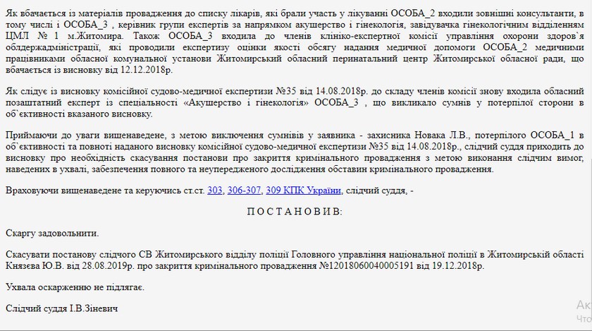 «Винесена передчасно, з порушенням вимог кримінально-процесуального законодавства щодо швидкого, повного та неупередженого розслідування, зокрема ст.79 КПК України, оскільки судово-медична експертиза по факту смерті породіллі ОСОБА_2 та дитини жіночої статі була проведена обласним позаштатним експертом ОСОБА_3, яка особисто приймала участь в проведенні перевірки Управління охорони здоров`я ЖОДА за результатами засідання клініко-експертної комісії, а тому це викликає обґрунтовані сумніви в її неупередженості при проведенні судово-медичної експертизи», - йдеться в матеріалах суду.