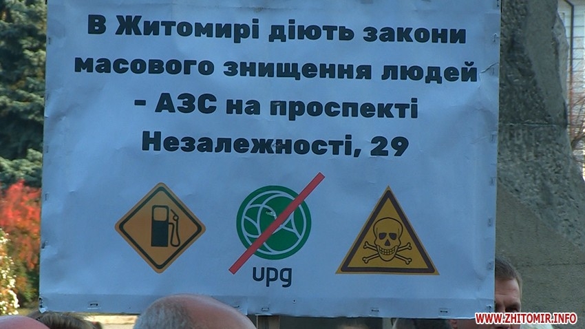 24 жовтня біля будівлі Житомирської облдержадміністрації зібралося кілька десятків містян – люди прийшли на акцію проти будівництва АЗС на проспекті Незалежності. До протестувальників вийшли голова ОДА Віталій Бунечко, Житомирський міський голова Сергій Сухомлин, народний депутат Ігор Герасименко. Врешті з’ясувалося, що забудовник не має оцінки впливу на довкілля. На підставі цього в управлінні Державної архітектурно-будівельної інспекції Житомирської області пообіцяли звертатися до Києва, аби там переглянули дозвіл на будівництво.