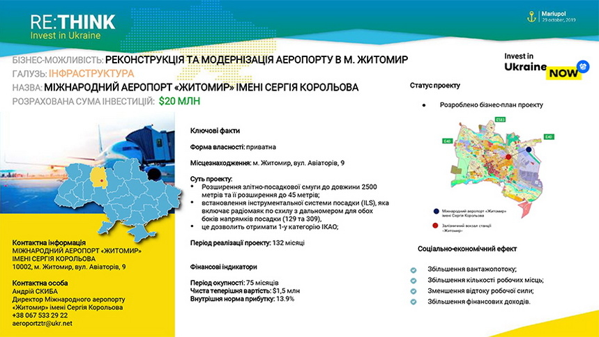 Під час Першого інвестиційного форуму «RE: THINK. Invest in Ukraine» представили 4 проєкти з Житомирської області на суму 38 млн доларів. У списку – аеропорт, індустріальний та інноваційний парки та логістичний центр.