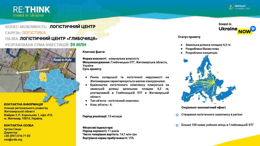 $9 млн потрібно для логістичного центру «Глибочиця». Форма власності – комунальна. Будівництво логістичного комплексу планується на земельній ділянці загальною площею 6,3 га, розташованій в Глибочицькій ОТГ в Житомирській області. Соціально-економічний ефект проєкту – створення логістичного комплексу в регіоні та більше 100 нових робочих місць в Глибочицькій ОТГ. Проєкт планують реалізувати за 15 місяців.