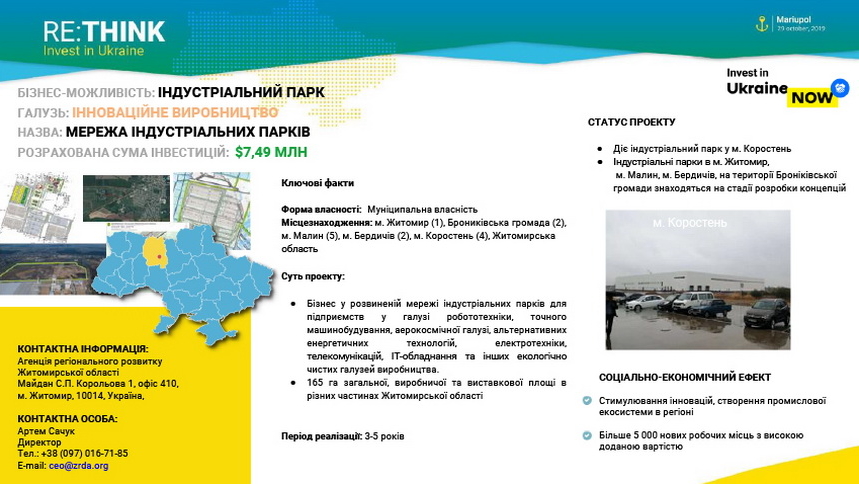 Протягом 3-5 років в області хочуть побудувати мережу індустріальних парків на суму 7,49 млн доларів. Такі парки побудують у Малині, Коростені, Бердичеві, Брониківській громаді та в Житомирі. Суть проєкту: бізнес у розвиненій мережі індустріальних парків для підприємств у галузі робототехніки, точного машинобудування, аерокосмічної галузі, альтернативних енергетичних технологій, електротехніки, телекомунікацій, ІТ-обладнання та інших екологічно чистих галузей виробництва. 165 гa загальної, виробничої та виставкової площі в різних частинах Житомирської області.