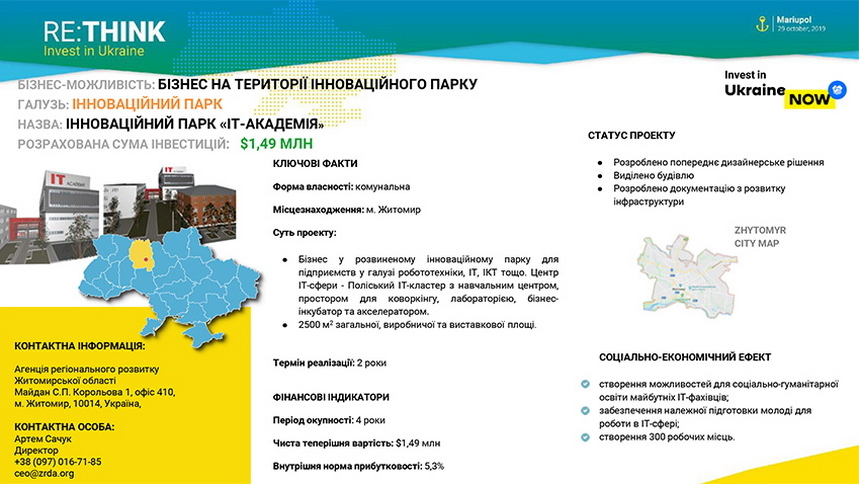 Для комунального інноваційного парку «It-Академія» потрібно 1.5 млн доларів. Проєкт передбачає бізнес у розвиненому інноваційному парку для підприємств у галузі робототехніки, ІТ, ІКТ тощо. Центр ІТ-сфери – Поліський ІТ-кластер з навчальним центром, простором для коворкінгу, лабораторією, бізнес-інкубатор та акселератором. 2500 м2 загальної, виробничої та виставкової площі. Період реалізації – 2 роки.