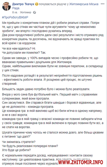 Нагадаємо, на сесії 31 жовтня 2019 мер Житомира пояснив, що не може ухвалювати рішення про звільнення заступника мера Дмитра Ткачука, бо він не написав заяву на звільнення. Пізніше Дмитро Ткачук пояснив, чому не написав заяву, і заявив, що готовий це зробити. Журналісти бачили заяву на його столі.