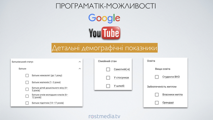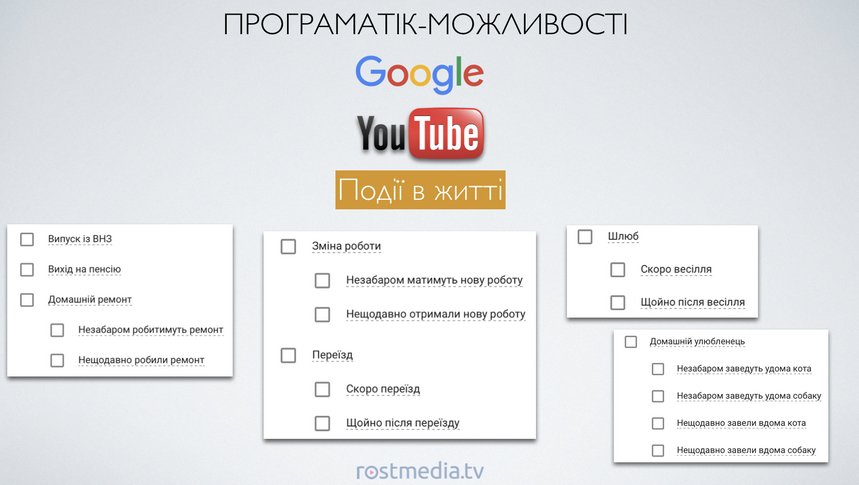 - готові зібрані аудиторії користувачів що шукали інформацію чи купляли в інтернет товари чи послуги майже будь-якої категорії;