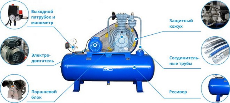 Классическая модель агрегата представляет собой чугунный цилиндр, внутри которого движется поршень. Ориентация цилиндра может быть различной – вертикальной, горизонтальной, наклонной. В его верхней части расположены клапаны, через которые рабочая среда всасывается внутрь цилиндра и выталкивается после сжатия. Поршень присоединен к кривошипно-шатунному механизму с коленчатым валом и электрическим или механическим приводом.