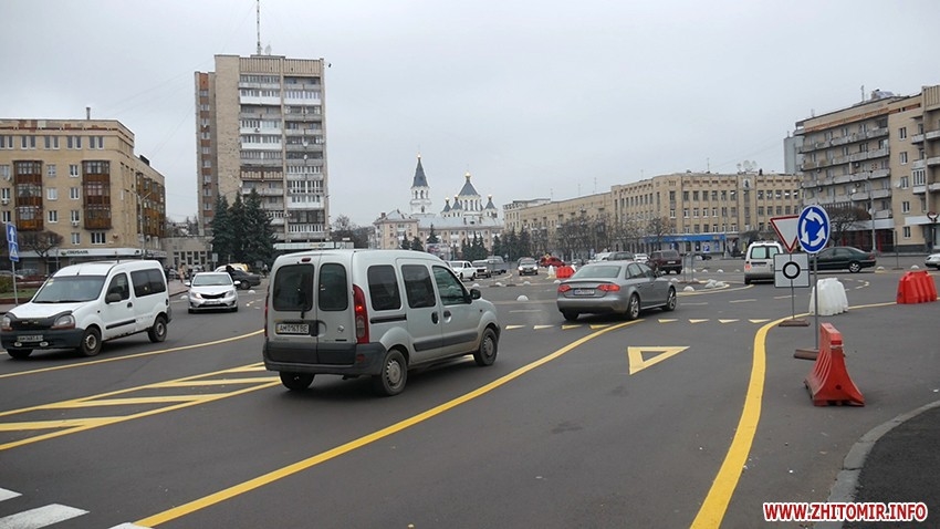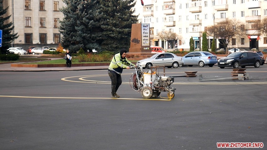 13 листопада на Соборному майдані в Житомирі почали наносити обіцяну розмітку: змінене коло, додаткові паркомісця, вільний простір. Що про неї думають водії, тут.