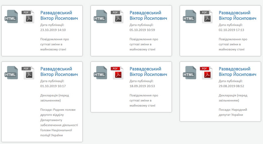 У Віктора Развадовського (екснардеп від Чуднівського округу №67) власної сторінки у Facebook немає, але інформація про його статки продовжує з’являтися в Єдиному державному реєстрі декларації. Нагадаємо, з 30 серпня по 1 жовтня 2019 року він працював радником голови другого відділу Департаменту забезпечення діяльності голови Національної поліції України, за цей час колишній нардеп отримав 54 тис. 699 грн зарплати, а після звільнення – 807 тис. 544 грн вихідної допомоги. 5 жовтня він повідомив, що 4 жовтня головне управління Пенсійного фонду України в місті Києві виплатило йому 101 тис. 478 грн – перерахунок та доплата пенсії по рішенню суду. 23 жовтня Развадовський оприлюднив повідомлення про те, що цього дня він став власником квартири в Києві площею 48,5 кв.м, яку за 2 млн грн купив у ПАТ «Діамантбанк». До цього часу у власності Віктора Развадовського була квартира у Києві площею 110,5 кв.м, яку він купив в грудні 2017 року за 5 млн 975 тис. 200 грн.