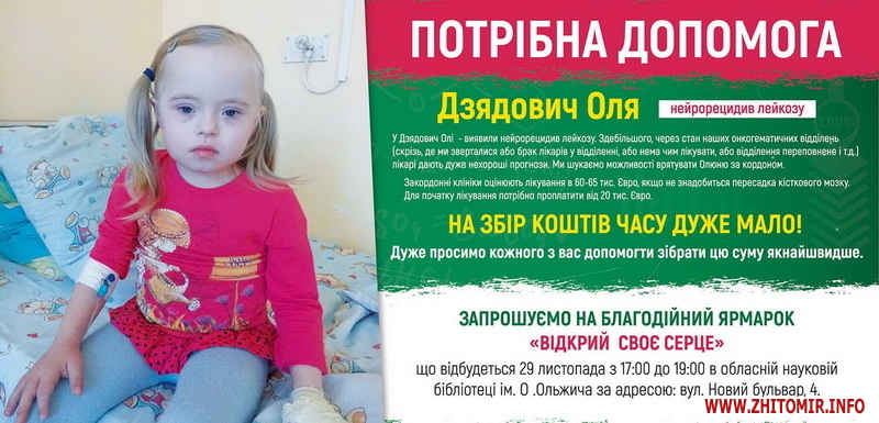 29 листопада 2019 року з 17:00 год. до 19:00 год. у Житомирській обласній науковій бібліотеці ім.О.Ольжича, що за адресою Новий бульвар, 4, відбудеться щорічний благодійний ярмарок «Відкрий своє серце!», присвячений збору коштів для лікування хворої на лейкоз Олі Дзядович.