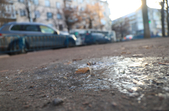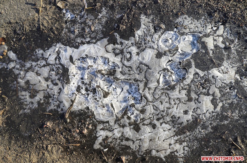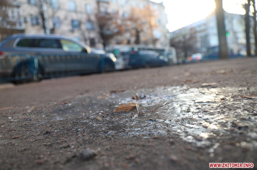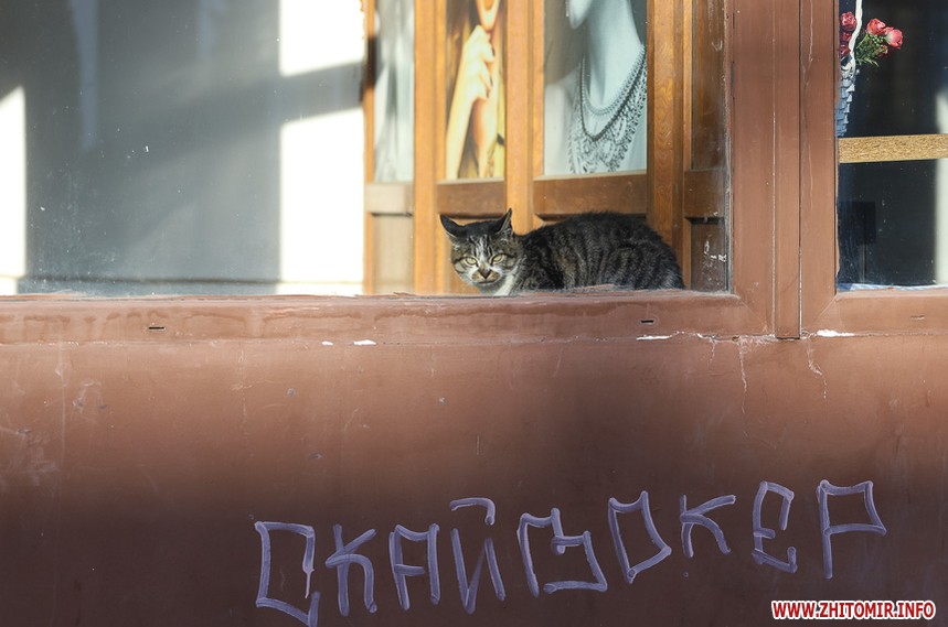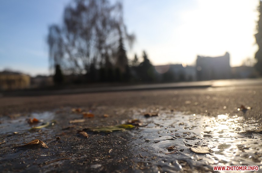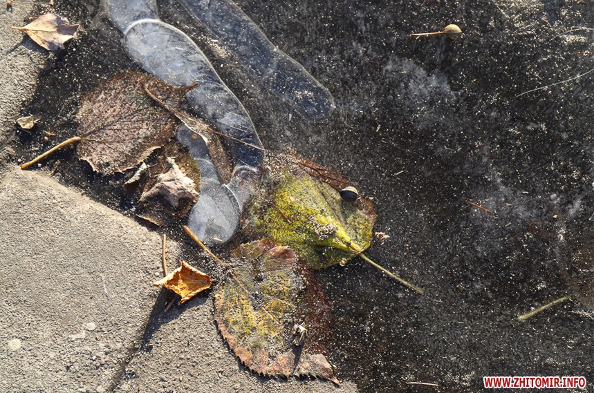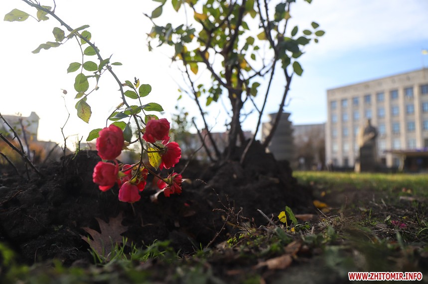 Холодна пора внесла свої корективи у буденну «картину» Житомира: на місці дрібних калюж на дорогах і тротуарах з’явилися заледенілі «скельця» з закованим жовто-коричневим листям, безпритульні тварини шукають таких скупих нині сонячних променів. Пейзажі з перевагою сірого кольору «розбавляють» квіти – коралові троянди та білі лобулярії.