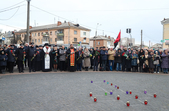 Учасники мітингу спільно виконали Гімн України, помолилися та о 16.00 год загальнодержавною хвилиною мовчання вшановували пам'ять померших. Люди принесли квіти, хліб і колоски до пам’ятного знаку «Сумуючий Янгол» та долучилися до загальноукраїнської акції «Запали свічу пам’яті».