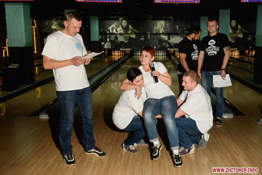 Усі команди за активну участь в конкурсах – отримали та продегустували мегакорисні яблучні чіпси Екофрутик – новинка на житомирському ринку. А перші щасливчики, що вибили страйк, отримали пиво ТМ Carlsberg, а от професіонали, які першими забили три страйки підряд – ТМ GREENDAY.