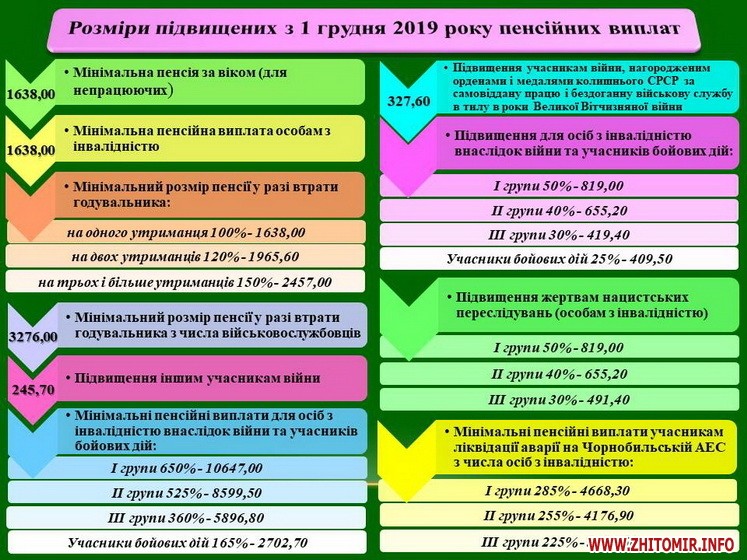 «У зв’язку з підвищенням з 01 грудня прожиткового мінімуму для осіб, які втратили працездатність, з 1564 грн до 1638 грн, головним управлінням Пенсійного фонду України в Житомирській області проведено перерахунок пенсійних виплат 321,3 тис. пенсіонерам області (85% ), на що у грудні місяці буде додатково спрямовано понад 10 млн грн», - поінформувало управління.