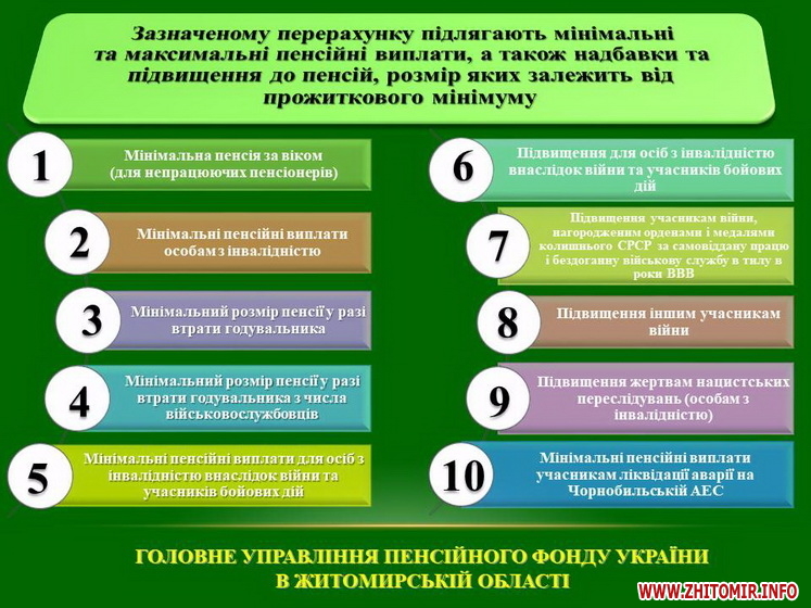 «Зазначеному перерахунку підлягають мінімальні та максимальні пенсійні виплати, а також надбавки та підвищення до пенсій, розмір яких залежить від прожиткового мінімуму. Зокрема: