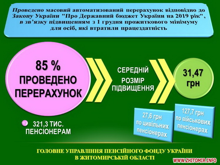 У зв’язку з підвищенням з 1 грудня 2019 року прожиткового мінімуму для осіб, які втратили працездатність, головне управління Пенсійного фонду України в Житомирській області провело перерахунок пенсійних виплат 321 тисячі пенсіонерам області, або 85% від усіх пенсіонерів.