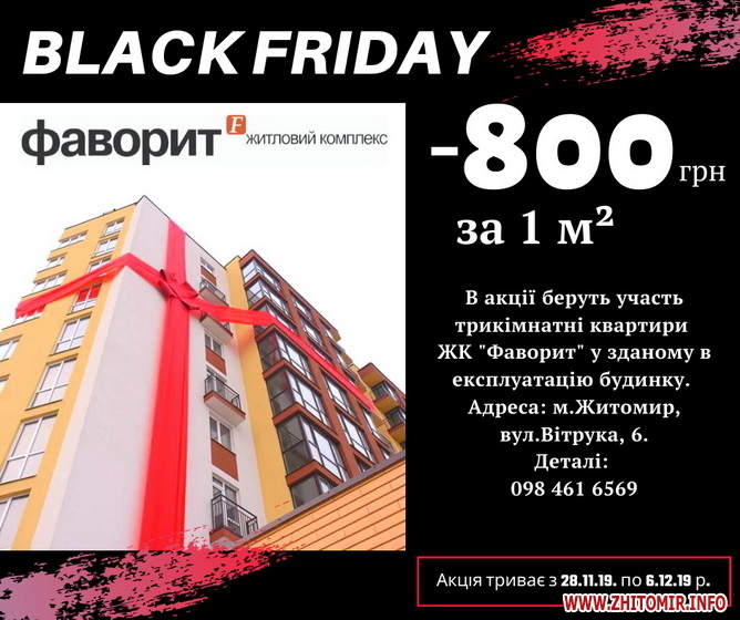 Black Friday у ЖК «Фаворит»: житловий комплекс «Фаворит» пропонує купити трикімнатну квартиру в Житомирі зі знижкою мінус 800 грн за квадратний метр. В акції беруть участь квартири зданого в експлуатацію будинку за адресою: м. Житомир, вул. Вітрука, 6. Будинок зданий в експлуатацію у 2018 році. Усі комунікації підключені.