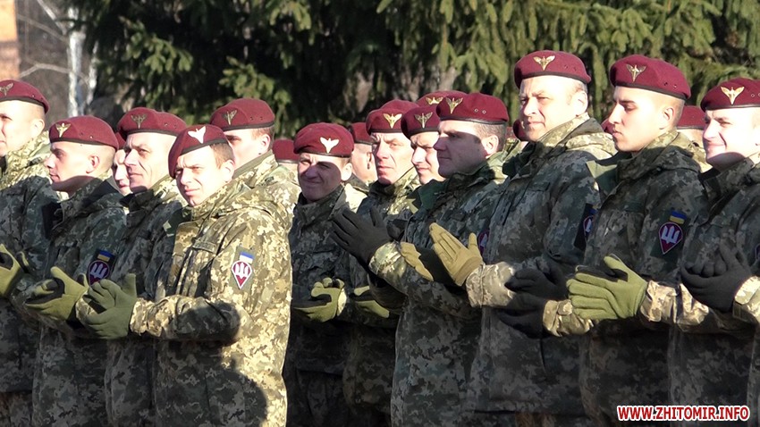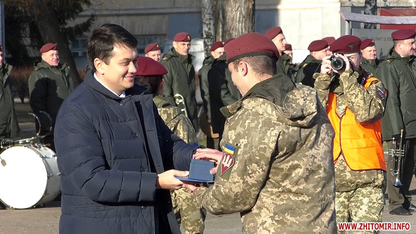 «Перш за все, хотів привітати зі святом, яке нещодавно минуло, та одночасно я хотів вас привітати з тим святом, яке наближається, адже 12 грудня - чергова річниця вашої бригади. Це славетна бригада і мені, як вихідцю з Житомирської області, дуже приємно сьогодні бути тут. Я хотів вам подякувати за той непростий шлях, який ви пройшли, за те, що сьогодні саме ви бороните територію нашої держави і за те, що в дуже важкі перші дні саме ви стояли і захищали Україну», – звертається до військовослужбовців голова Верховної ради України Дмитро Разумков.