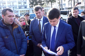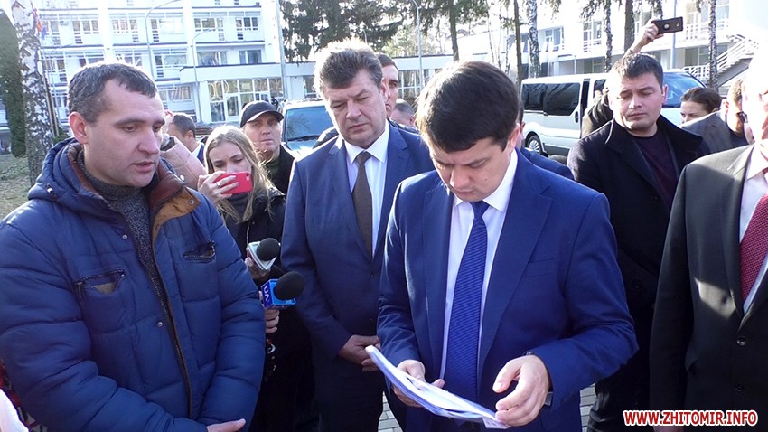 Біля виходу з Центру вертебрології делегацію зустріли противники будівництва АЗС на проспекті Незалежності у Житомирі. Вони звернулися до голови Верховної ради України, аби той допоміг розв'язати їхню проблему.