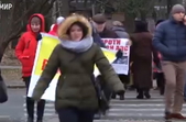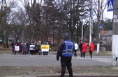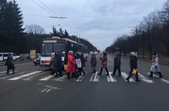 Люди з плакатами в руках рухаються по пішохідному переходу. На місце проведення акції приїхали правоохоронці.