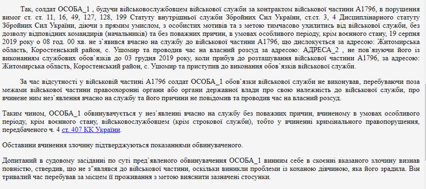 У період з 19 серпня по 3 грудня 2019 року даний військовий без поважних причин ухилявся від військової служби та проводив час на власний розсуд.