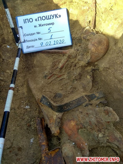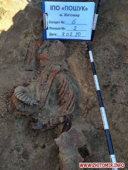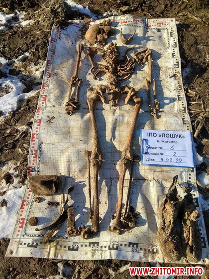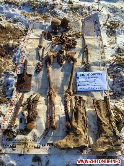 «Виїзд 9.02 в Пулинський район приніс результати. Знайдено 2-х одиночних солдатів РСЧА по липневим боям 1941-го року. 1-го солдата знайшли завдяки саперній лопаті, яка висіла у нього на поясі. Лопатка лежала боком, і тому сигнал був дуже слабким, але щось підштовхнуло нас затриматись на тому місці і більш детально перевірити. Наші очікування виправдалися...там був солдат. При ньому ножни з під штик-ножа СВТ-38, декілька монет та ялові чоботи. Воїн не мав при собі медальйону та документів, тому залишиться невідомим. 2-й солдат був знайдений на метровій глибині. Мав при собі протигаз, підсумок старого типу, а в халяві чобота лежала ложка. Скоріш за все загинув від близького вибуху снаряду, так як мав сильно деформований череп, а в протигазній масці лопнули всі окуляри. Цей воїн також залишиться невідомим», - йдеться у дописі пошуковців.
