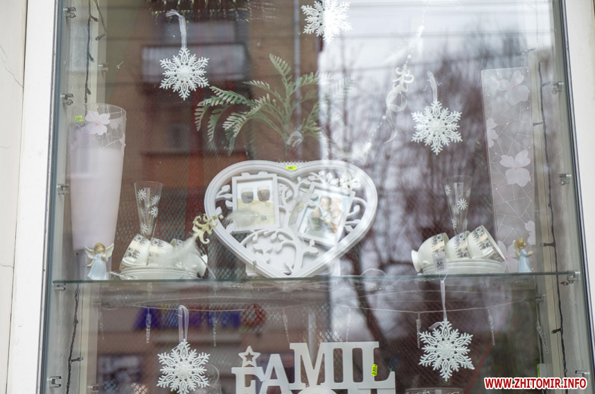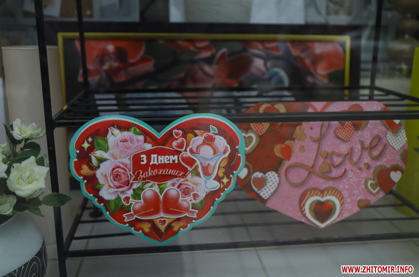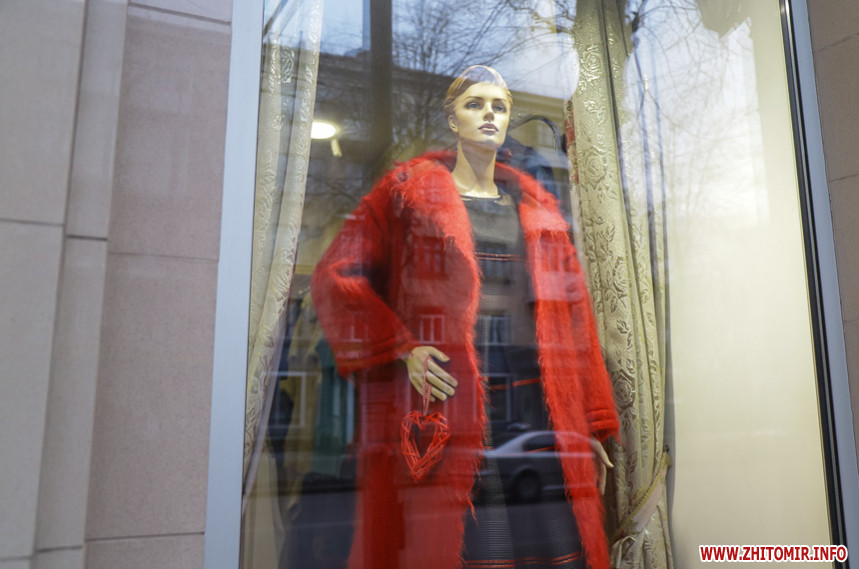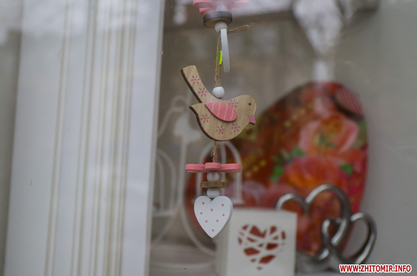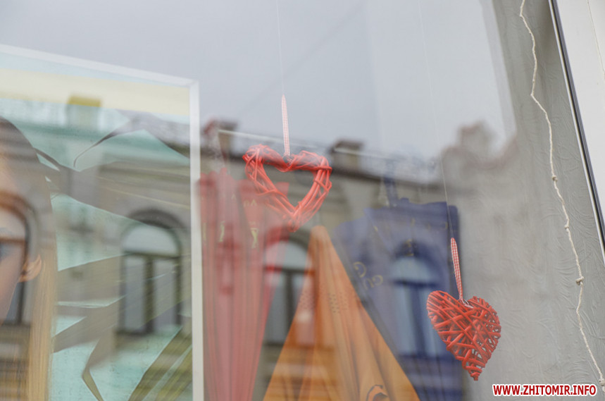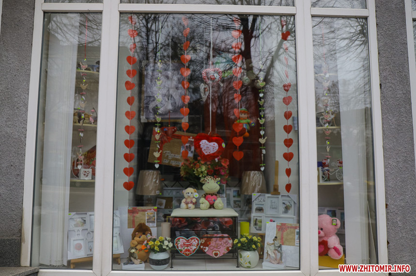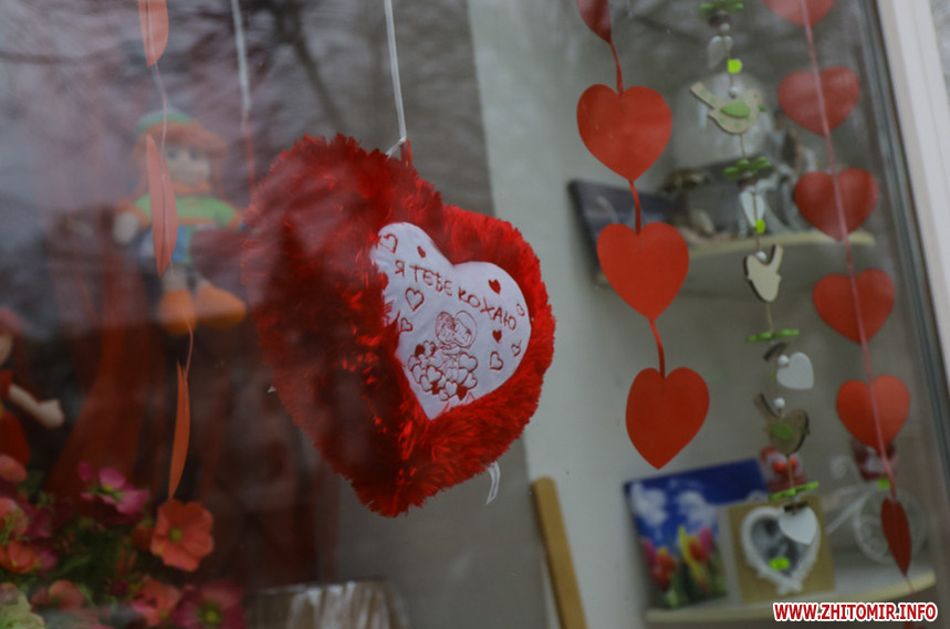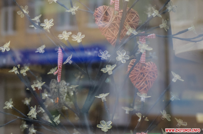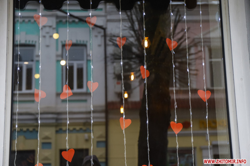 На вулицях Житомира до святкування Дня святого Валентина готуються не активно. У вітринах та вікнах закладів ще й досі ялинки, сніжинки та Санта Клауси. Лише поодинокі власники розбавили картину червоними сердечками.