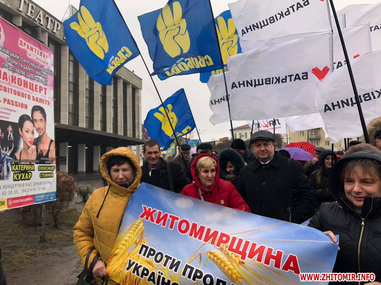Цього дня в драмтеатрі відбулася зустріч фермерів з народними депутатами, після якої кілька десятків людей з плакатами та прапорами партій ВО «Свобода», ВО «Батьківщина» та Радикальна партія Ляшка пройшли ходою по вулиці Великій Бердичівській від театру до майдану Корольова. Організатори акції планували вручити озвучені на зібранні вимоги керівництву Житомирської обласної державної адміністрації.