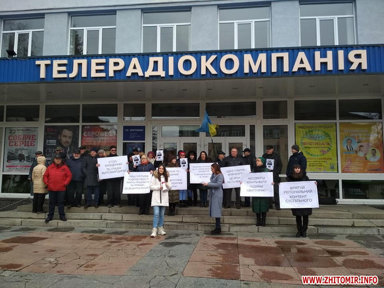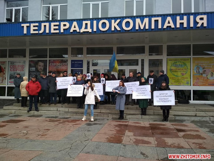 25 лютого працівників «UA:Житомир» зібралися біля телецентру з плакатами, на яких закликають, зокрема, «врятувати регіональний контент Суспільного».