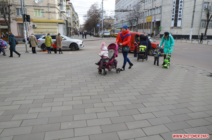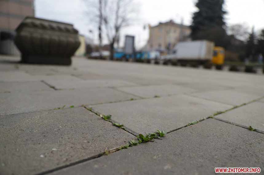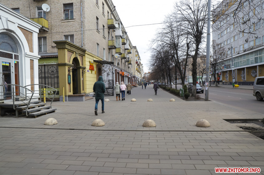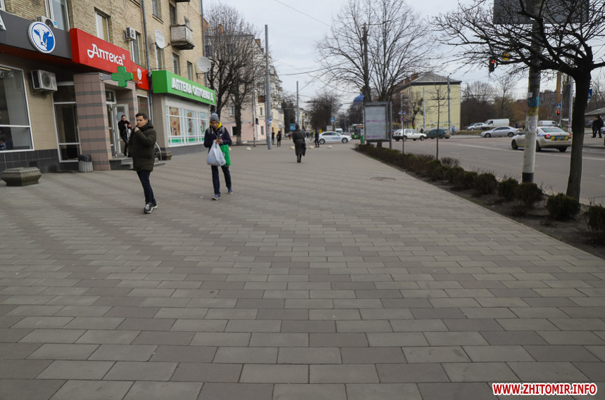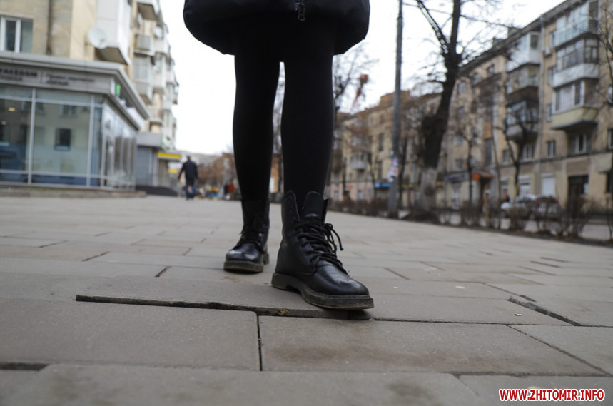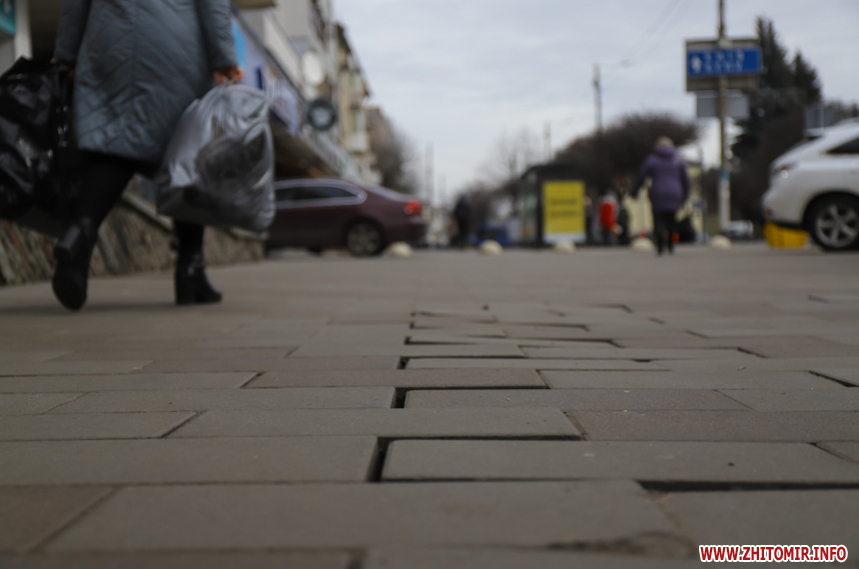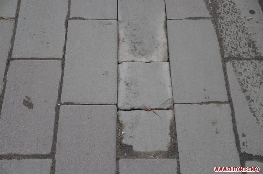 Подекуди потріскана та побита, десь просіла чи «вийшла зі строю» і хитається – тротуарна плитка на вулиці Київській у Житомирі трохи «зносилася» і наприкінці зими-2020 має неідеальний вигляд. У деяких місцях «цеглинки» розкололися надвоє, також бруківка дещо втратила свій первісний колір.