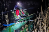 «Ввечері 9 березня в команду спасіння тварин звернулась жителька села Новаки, що біля Коростеня, і повідомила, що на ставку знаходиться лебідь з травмованим крилом. Зазвичай у таких випадках, коли лебедю не загрожує термінова небезпека, екіпаж формується завчасно і приїжджає вдень, щоб виконати роботи завидна. Але виявилось, що лебедю загрожували браконьєри. За словами заявниці, вони чекали неподалік, доки всі підуть, щоб добути його. Жителі змогли прогнати браконьєрів, проте ті могли повернутися вночі, тому рятувати лебедя потрібно було терміново. Нічна дорога до села була досить складною через густий туман. Озеро досить велике, сильно заросло очеретом. Поранений лебідь добре ховався, а в туманіЮ який погона пробивав навіть промінь потужного прожектора, пошуки велись практично всліпу. Лише після трьох годин пошуків в очереті лебедя вдалось знайти та впіймати. Майже о 4 ранку 10 березня лебідь був доправлений в Садибу Нюшаниково. Допомога птахам. У нього серйозна травма крила, скоріш за все, потребуватиме оперативного втручання», - повідомили рятувальники тварин.