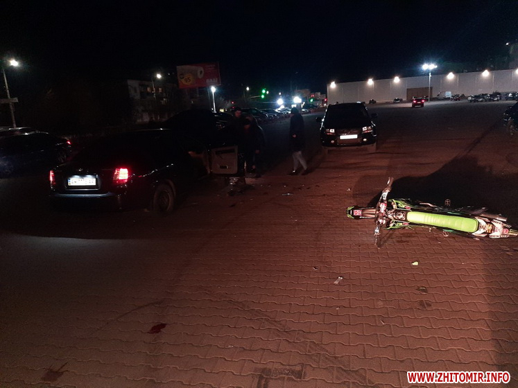 «Попередньо, на вулиці обласного центру сталося лобове зіткнення автомобіля «Chevrolet» під керуванням 40-річного місцевого жителя та мотоцикла «Kawasaki», за кермом якого перебував 39-річний житомирянин. У результаті ДТП водій мотоцикла отримав травм та був доставлений до лікарні. Нині триває встановлення причин та обставин події у рамках кримінального провадження, розпочатого за ч. 1 ст. 286 (Порушення правил безпеки дорожнього руху або експлуатації транспорту особами, які керують транспортними засобами) Кримінального кодексу України», – йдеться у повідомленні.