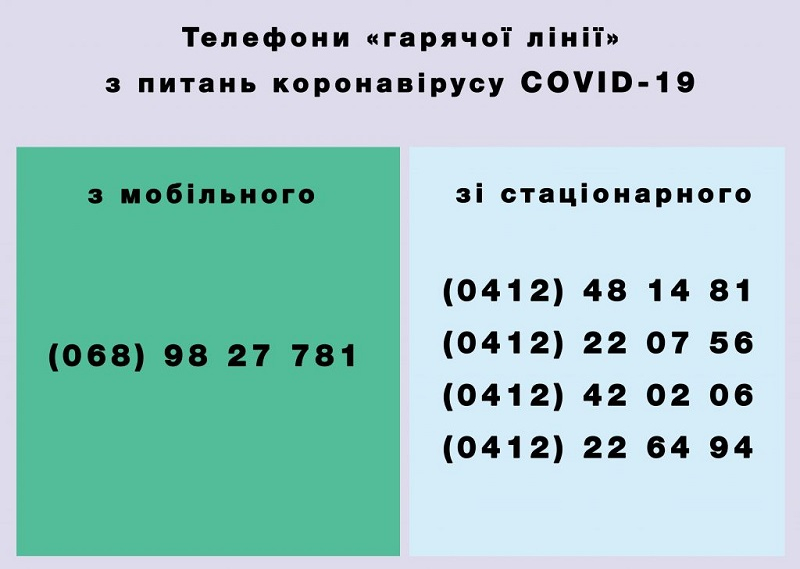 Якщо є питання щодо методів захисту себе та близьких від захворювання, яке може викликати коронавірусна інфекція, можна телефонувати на «гарячу лінію» за номером телефону: (0412) 44 85 62. Консультації надаються щоденно (з 9.00 до 17.00 години, перерва з 13.00 до 14.00), окрім вихідних та святкових днів.
