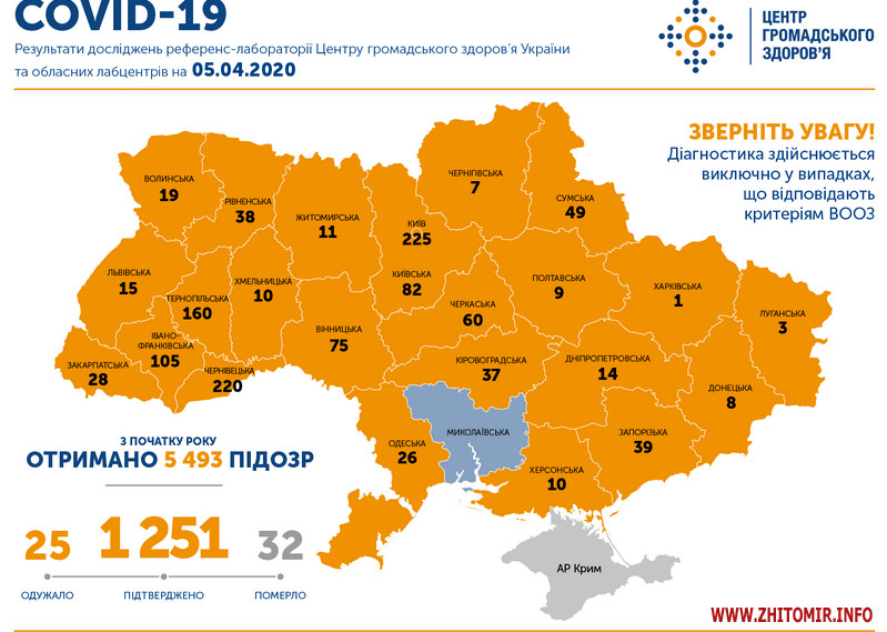 В Україні станом на 10:00 5 квітня лабораторно підтверджено 1251 випадок COVID-19, в тому числі 11 – у Житомирській області, з них 2 летальні.