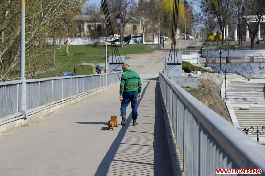 Схоже, житомиряни таки слухняно дотримуються постанови Кабміну про карантин, зокрема тієї частини, що стосується заборони відвідування парків, скверів, зон відпочинку, лісопаркових та прибережних зон (крім вигулу домашніх тварин однією особою та в разі службової необхідності). Не порушувати карантин «допомагають» правоохоронці, які цілими групами чатують на Старому бульварі та в парку Гагаріна. А домашні песики стали таким собі талісманом для своїх господарів й «оберігають» їх від зауважень правоохоронців і дають можливість насолодитися теплим весняним днем на природі.