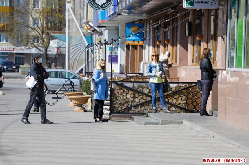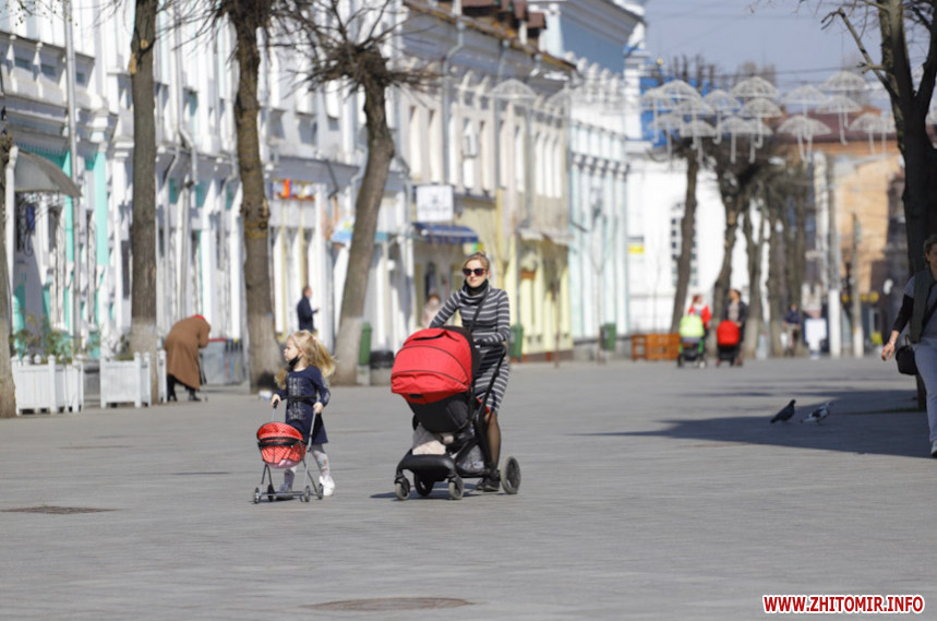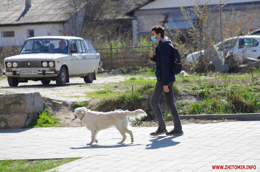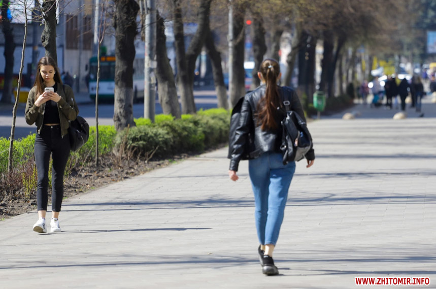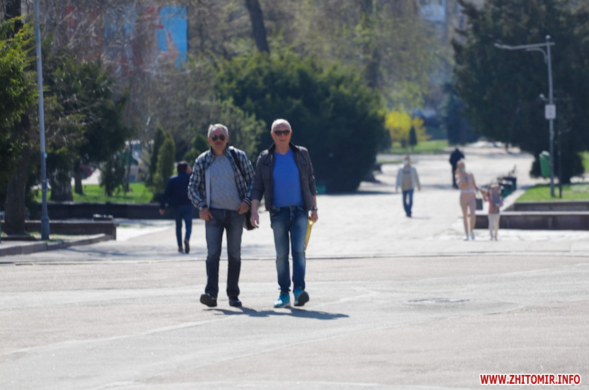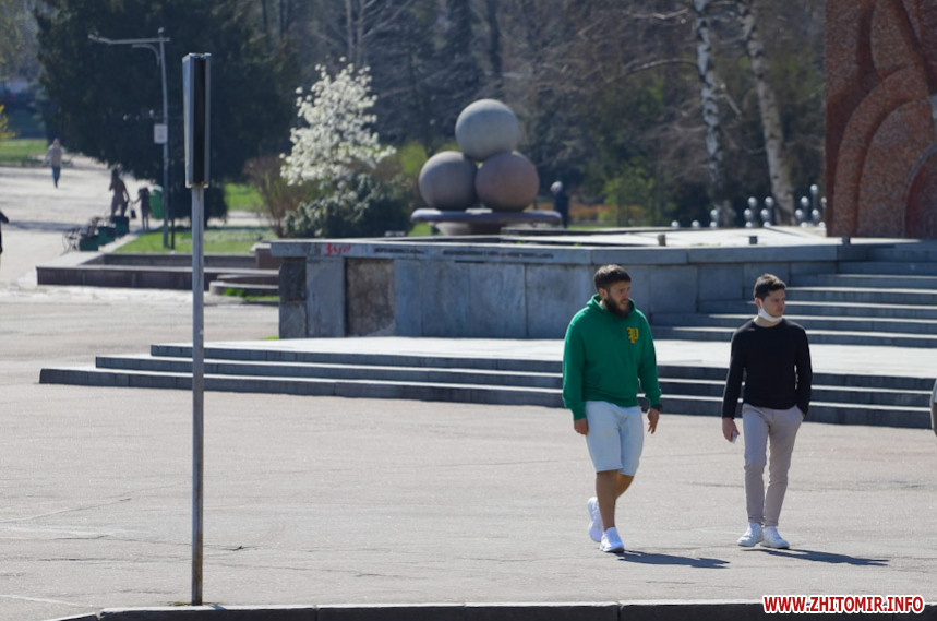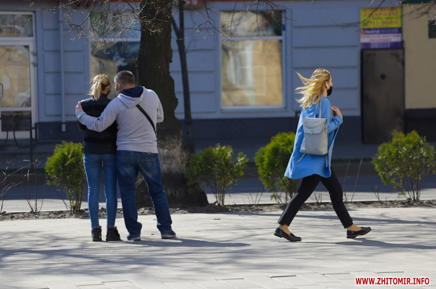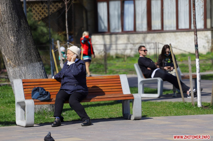 Щоправда, вдень 9 квітня у центрі Житомира було доволі людно: хтось поспішає у справах, а дехто присів на лавочку та приймає сонячні ванни. Радіють теплу і тварини: кішки муркочуть і бавляться на мякій траві.