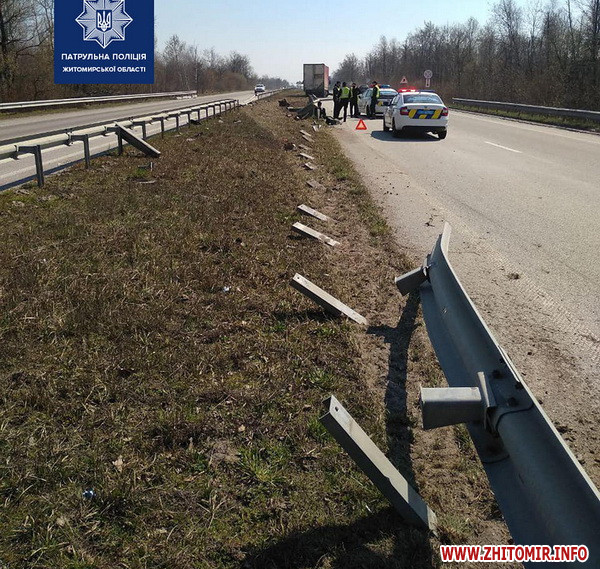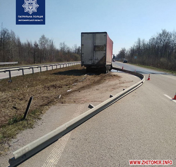 «Неуважність водія, знову призвела до ДТП. 9 квітня, близько 13-ї години, спецлінії 102 надійшло повідомлення, що на автодорозі «Київ — Чоп» поблизу села Новий Завод Пулинського району трапилась дорожньо-транспортна пригода. На місці інспектори патрульної поліції з'ясували, що 23-річний водій вантажівки Renault Premium, під час руху не був уважним, не обрав безпечної швидкості, не врахував дорожньої обстановки та здійснив наїзд на колесовідбійник», - йдеться у повідомленні.