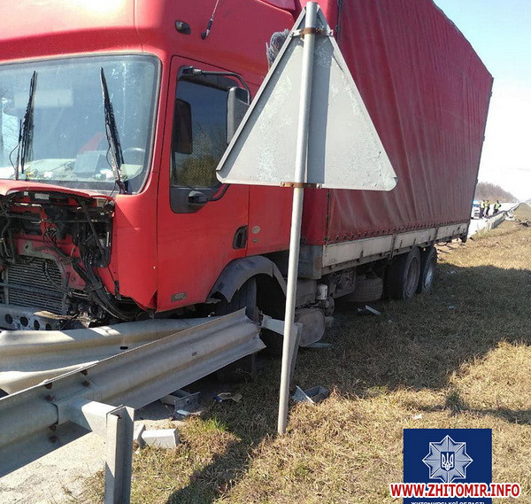 Як повідомляв Житомир.info, вранці 8 квітня 2020 на трасі Київ-Чоп в Пулинському районі зіштовхнулися дві вантажівки: на дорозі розкидані уламки та розсипані пляшки.