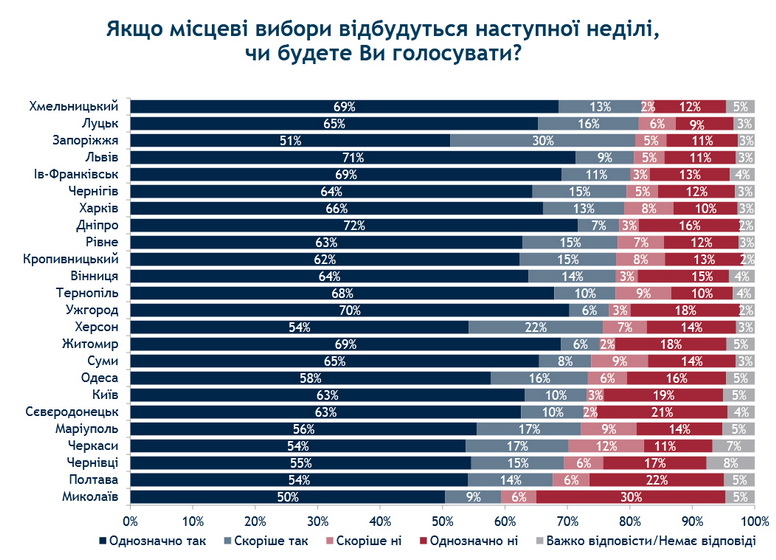 Водночас з таким високим показником готовності проголосувати 18% житомирян заявили, що однозначно не підуть на вибори.
