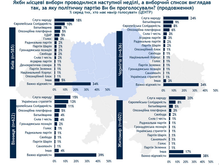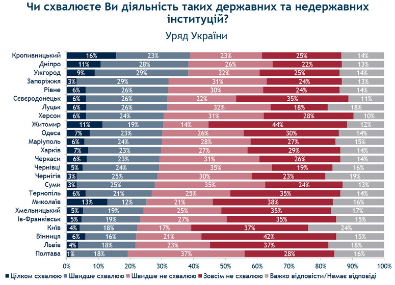 Щодо діяльності центральних органів влади, то в Житомирі найвищий відсоток тих, хто зовсім не схвалює дії Уряду – 44%, на другому місці за цим показником Вінниця (42%), в інших обласних центрах однозначне несхвалення менш ніж 40%. Також в Житомирі 41% опитаних зовсім не схвалює дії Верховної ради, більше лише у Вінниці – 43%.