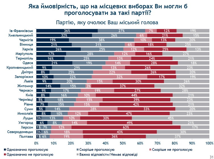 Такі дані наведені в шостому всеукраїнському муніципальному опитуванні, проведеному соціологічною групою «Рейтинг» від імені Центру аналізу та соціологічних досліджень Міжнародного республіканського інституту.