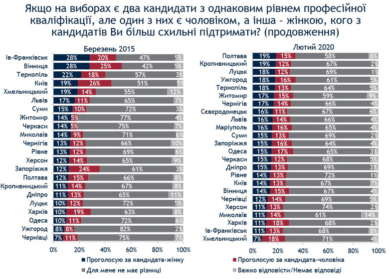 Обираючи за статтю між двома рівними кандидатами 17% опитаних житомирян готові підтримати жінку, 15% - чоловіка, для 59% різниці немає.