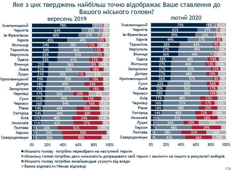 Від часу проведення п’ятого муніципального опитування (з 7 вересня по 10 жовтня 2019 року) зменшилася кількість тих, хто вважає, що мера Сергія Сухомлина треба переобрати на другий термін: минулого року таких було 34%, зараз – 27%.