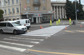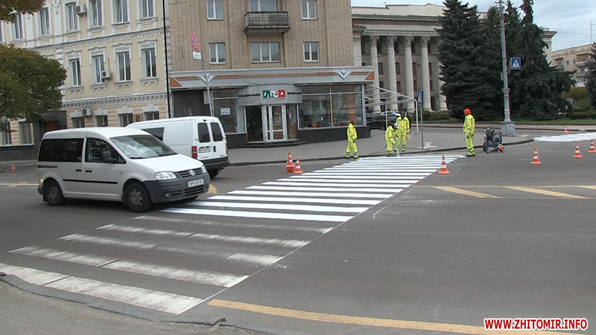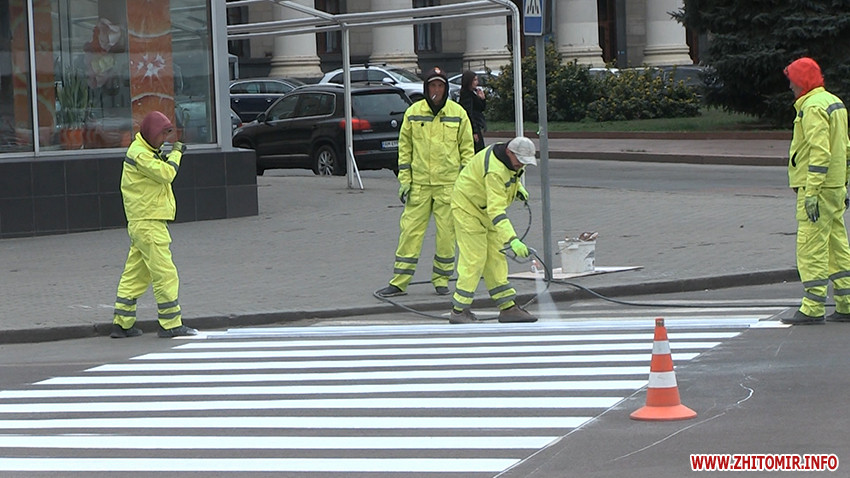 «У нас з 21 на 22 квітня обмеження руху. Сьогодні о 21:00 обмежено рух на майдані Соборному. Зараз почали малювати пішохідні переходи, на вулицях, які примикають до майдану. Було зауваження, що проєкт і схема організації дорожнього руху на майдані Соборному не відповідає на сьогодні ДБН у зв'язку тим, що проєкт розроблявся у 2017 році, а у 2018 році були зміни до ДБН, а саме по організації дорожнього руху. Була скликана комісія з безпеки дорожнього руху у зв'язку з тим, щоб надати проєктанту завдання проаналізувати проєкт 2017 року на відповідність до ДБН. Буде це завтра чи післязавтра – все залежить від відповіді проєктанта, чи відповідає дана розмітка на майдані чинним нормам», – каже заступник Житомирського міського голови Олександр Шевчук.