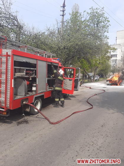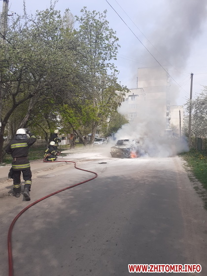 «25 квітня о 10:44 до Служби порятунку «101» надійшло повідомлення про загоряння легкового автомобіля. Прибувши до місця події о 10:51 було встановлено, що горить відсік двигуна. Власник автівки повідомив, що вогонь спалахнув під час руху, до прибуття вогнеборців він намагався загасити загоряння вогнегасником, але його зусилля були марними. Для ліквідації пожежі було залучено 1 одиницю техніки та 4 чоловіки особового складу 1-ї Державної пожежно-рятувальної частини міста Житомир», - йдеться у повідомленні.