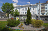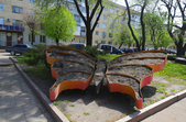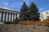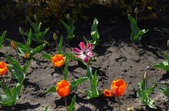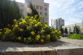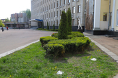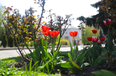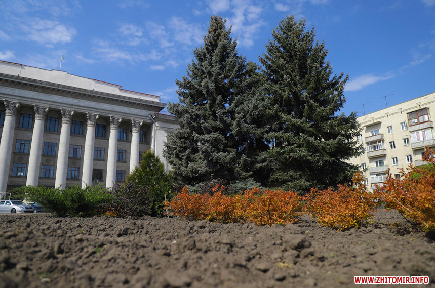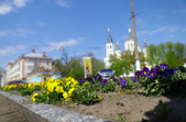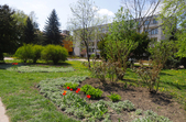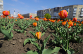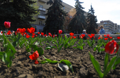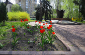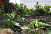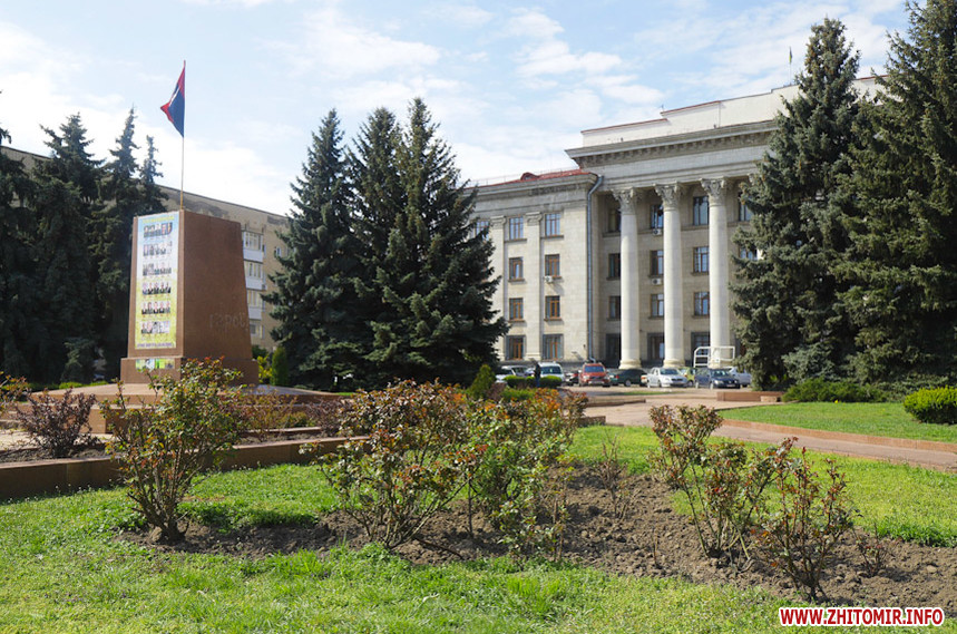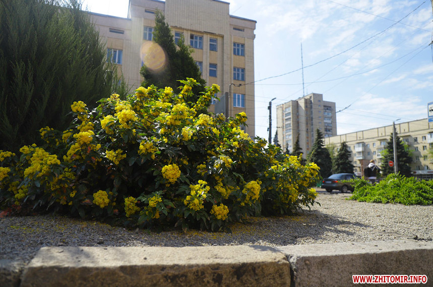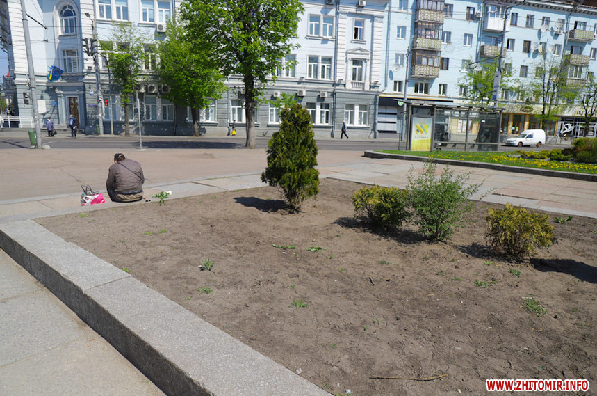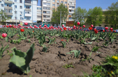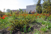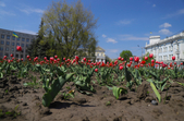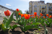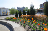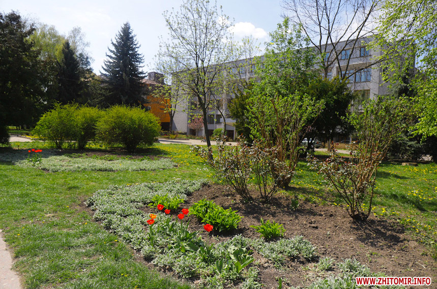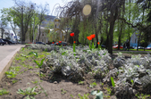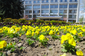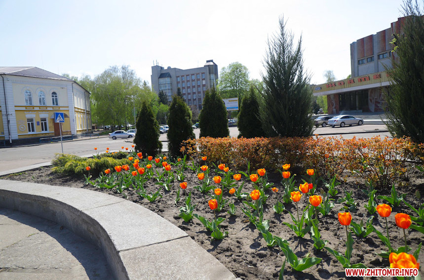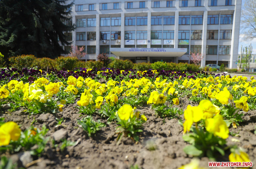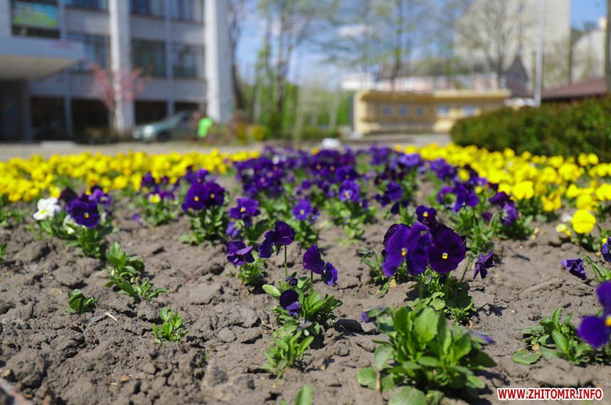 На клумбах біля обласної бібліотеки розцвіли фіалки, а на майдані Корольова різнокольорові тюльпани.