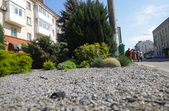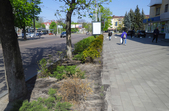 У центрі міста поодинокі працівники комунальних служб приводять в порядок клумби. Більшість з них доглянуті та политі. Проте у деяких місцях рослини все ж всихають.
