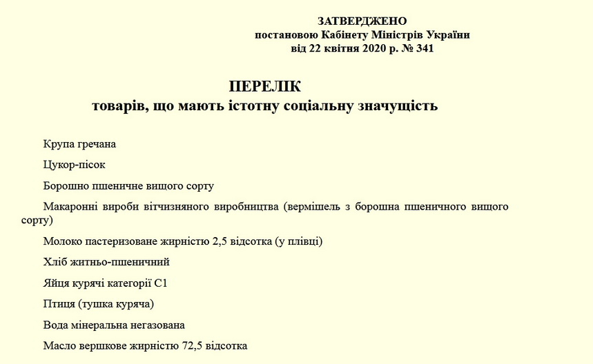 «Кабінет Міністрів України прийняв постанову від 22.04.2020 № 341 «Про заходи щодо стабілізації цін на товари, що мають істотну соціальну значущість, товари протиепідемічного призначення», якою тимчасово запроваджується державне регулювання цін на товари, що мають істотну соціальну значущість та товари протиепідемічного призначення шляхом декларування зміни роздрібних цін у разі їх збільшення. Відповідно до пункту 3 Постанови вона набирає чинності через десять днів з дня її опублікування і діє до закінчення карантину, встановленого постановою Кабінету Міністрів України від 11.03.2020 № 211 «Про запобігання поширенню на території України гострої респіраторної хвороби COVID-19, спричиненої коронавірусом SARS-CoV-2». Постанову було опубліковано 08.05.2020 у газеті «Урядовий кур’єр» № 87, а отже 18.05.2020 вона набирає чинності (виділено ред.)», - йдеться у повідомленні.