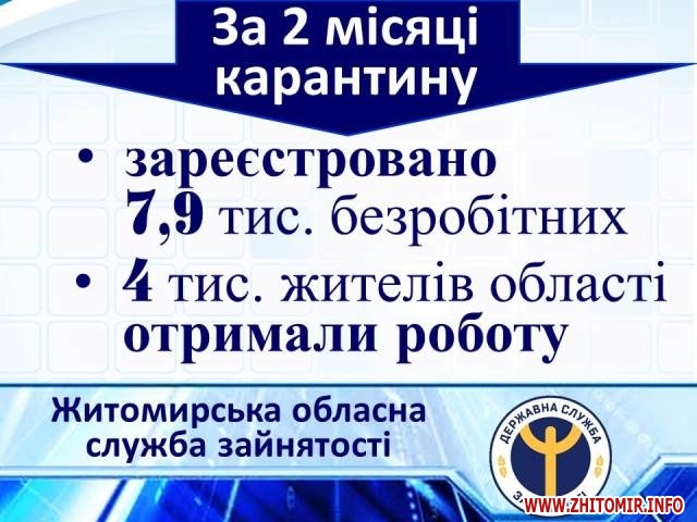 За період з 12 березня по 15 травня службі зайнятості роботу вдалося знайти майже для 4 тисяч жителів Житомирської області. Статус безробітного отримали 7,9 тис. осіб, що на половину більше, ніж минулого року.