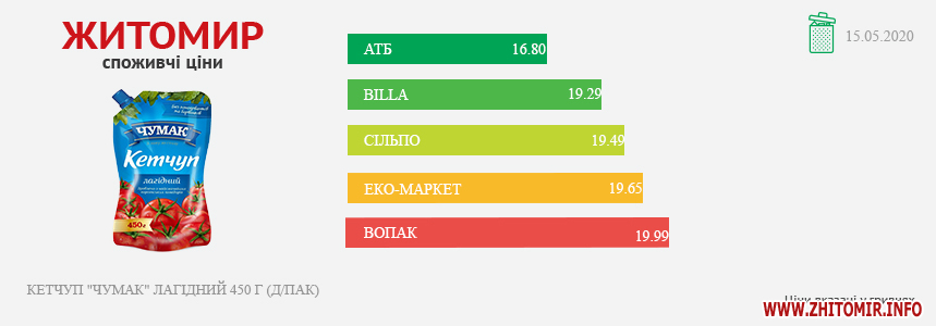 МОНІТОРИНГ ЗДІЙСНЕНО МЕТОДОМ КОНТРОЛЬНОЇ ЗАКУПІВЛІ, У МІСЦЯХ ПРОДАЖУ: AТБ, пр. Миру, 15 А, Billa, пр. Миру, 15, Вопак, вул. Київська, 87, ЕКО-маркет, вул. Мала Бердичівська, 2/7, Сільпо, майдан Житній ринок, 1